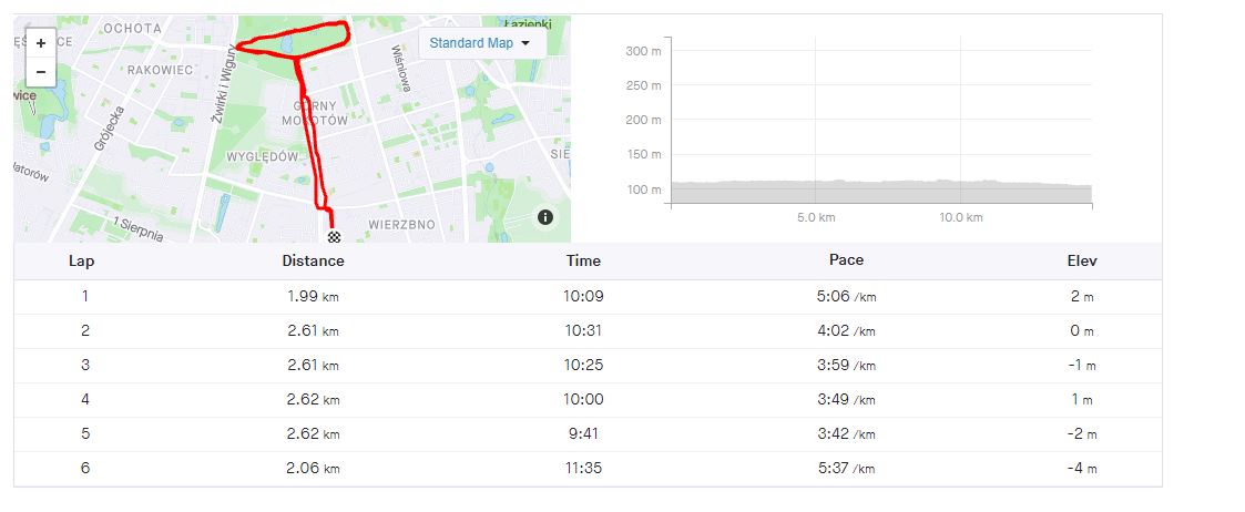 Po 5 kilometrach w 19:07 – wsiadłem w auto i podjechałem do pobliskiego Konstancina Jeziorna, gdzie chciałem zrobić trening i przetestować przy okazji kilka rzeczy: