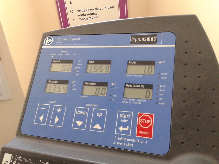 Została mi założona maska badająca wdychane i wydychane powietrze, podłączone elektrody mierzące parametry sercowe i po chwili już wspinałem się powolnie pod 10 % wzniesienie.